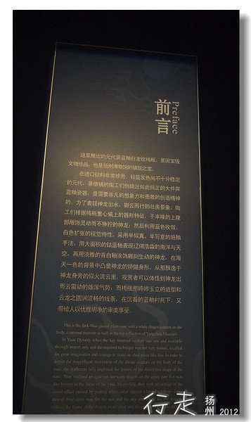 吃完中饭已快两点了,接下去睡觉的睡觉,逛街的逛街,我去了扬州博物馆,了解一个城市从早点开始之后,还得去逛逛博物馆,那是一个城市的精髓所在。扬州博物馆在新区,建筑面积不小,是新建成的,将中国雕版印刷博物馆和扬州博物馆合并起来了,就是现在所说的扬州双博馆。在没进来之前想像的是博物馆应该不会太大,而且布展陈设文物不会特别多,但个人实在是太喜欢博物馆了,所以只是随便来看看。但是进馆后感觉扬州博物馆的馆藏品的精彩已超过这座城市的规模,还是值得一去。博物馆还是一如继往的免费,这个博物馆没有可租的导游讲解器,人工导游50元一次,但讲解很简单。