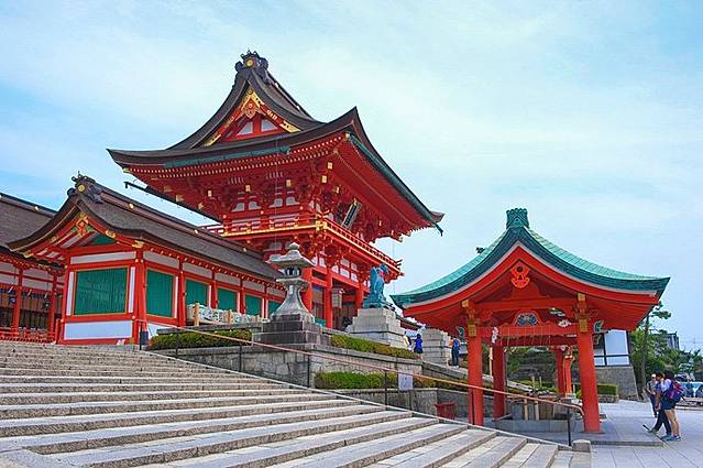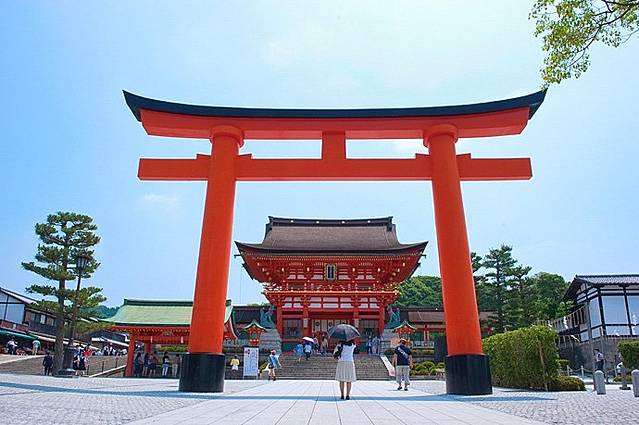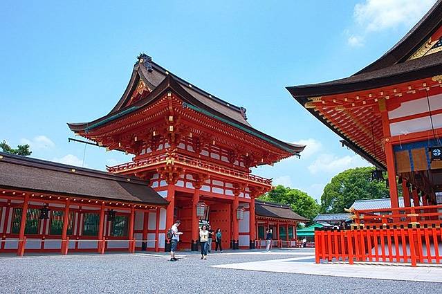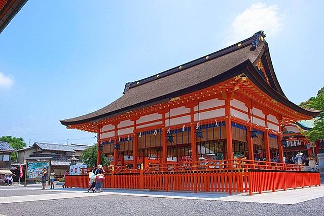 伏见稻荷大社位于稻荷山的山麓,在传统上整个稻荷山都被视为是神域(圣地)的范围。神社的整体建筑都是非常鲜艳的朱红色,绘金描彩,给人与众不同的感觉。据说因为朱红色有降妖除魔的法力,对于稻荷而言,朱红色还代表万物丰收秋天的色彩。