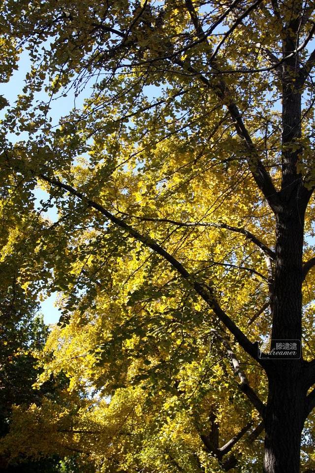 从办公室出发,体会一下APEC蓝。SOHO穿过马路直行,恩哼,就是有优衣库那个口,穿过酒吧街,白杨树的大眼睁和你眨了眨,就是我们美丽的银杏路。