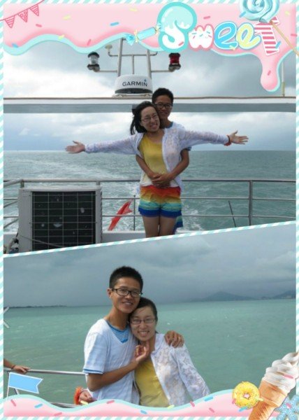 在游艇上两人的臭美照……