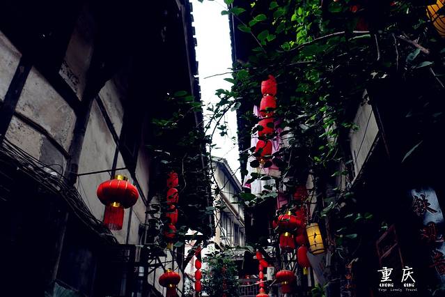 随着人潮涌动,红灯笼已高高挂起,我们到了【磁器口】,人多的挪不动步子,只能照照看似不谙世事的一线天空。