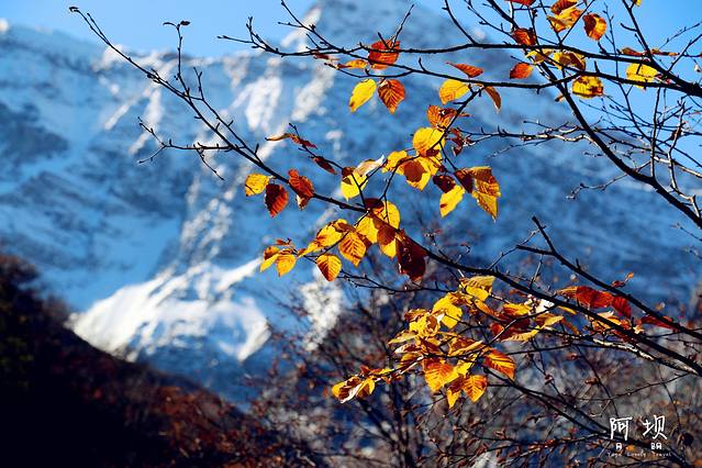 【日则沟】的尽头是原始森林,可以看到雪山隐隐约约在远方连绵。