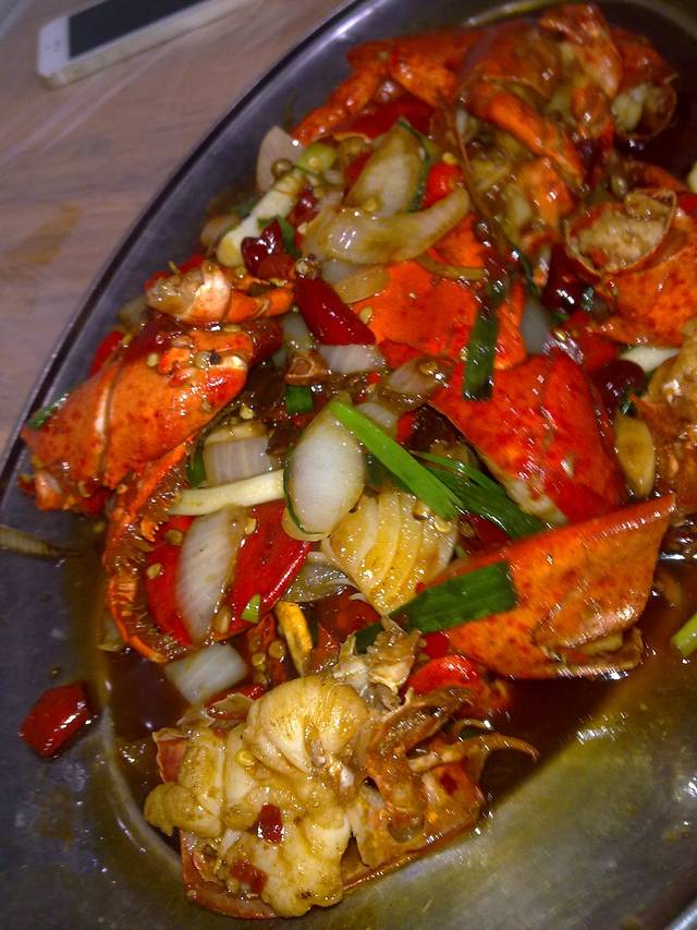 一只大龙虾被砍成这样,呜呜残忍的人类,不过龙虾肉很Q