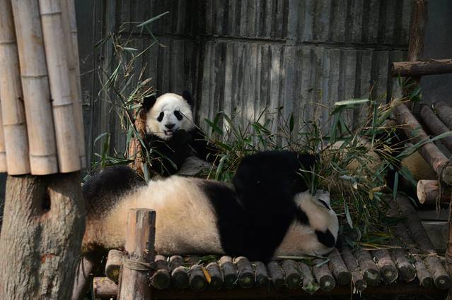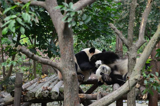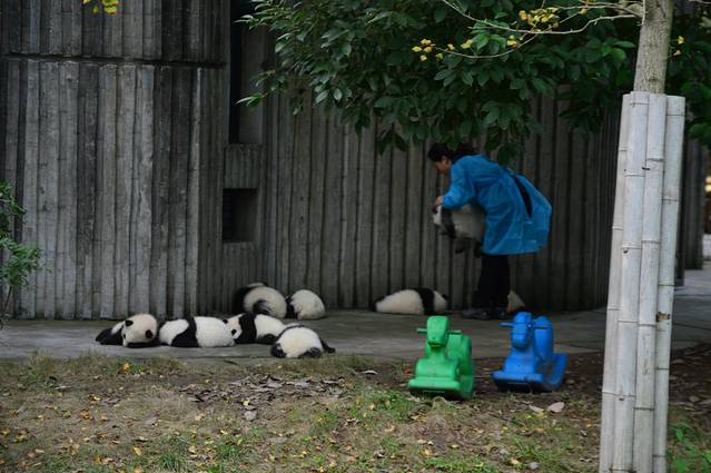 一帮熊猫崽子,集体午睡,纹丝不动,除了一个头顶着墙的,不停抖屁股,做噩梦了吧,据导游说可以花2000元抱一次熊猫,不过之前还要做一天的义工,才能抱着照几张像。也算是为了熊猫保护事业贡献力量了吧。
