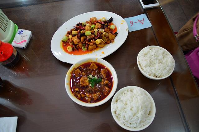 进去之前吃了个午饭,陈麻婆豆腐,据说是正宗的,快餐形式,柜台点菜交钱,然后上菜,点菜的阿姨感觉一脑门子官司,眉头皱的那个紧,我都不敢点了。正宗川菜麻婆豆腐和宫保鸡丁,米饭竟然不是随便吃的,不过1块钱一碗也不贵,味道还行,不过也没啥特殊的,除了麻婆豆腐更麻一点,这点我很欣赏。
