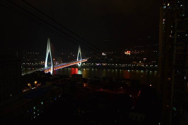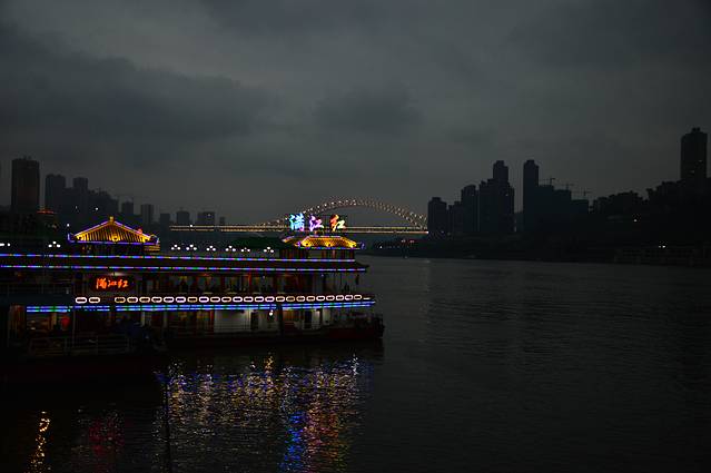 朝天门是我第一个知道的重庆的具体地点,所以也一直对这里很向往,不过洪崖洞到朝天门的距离比较尴尬,说近不近,说远不远,又心疼打车贵,就沿着渝中半岛嘉陵江沿岸走了过去,重庆气候比较湿润,对北京呆惯了的人来说倒是个补水的好机会,不过不巧的是朝天门地区施工,整个围了起来,只能绕到长江那侧走到半岛尖端,着实走了一通,走到朝天门尖上天也黑了,看不清两江交汇的盛景,实在可惜,不过朝天门的夜景也不错,岸边停着很多游轮,价格还算公道,可以买票去江上看看夜景,我们时间有限就没去。