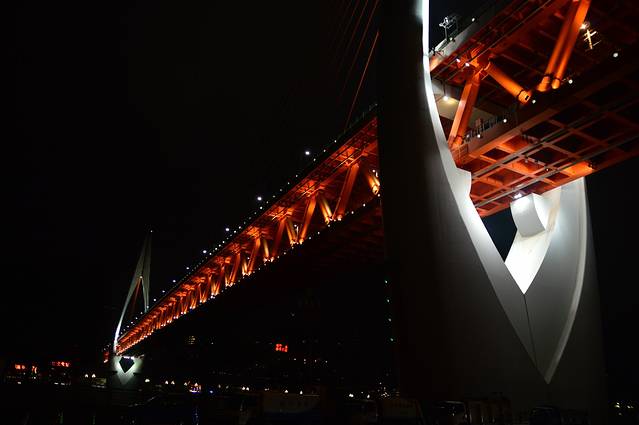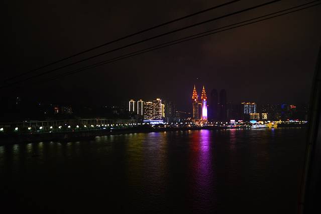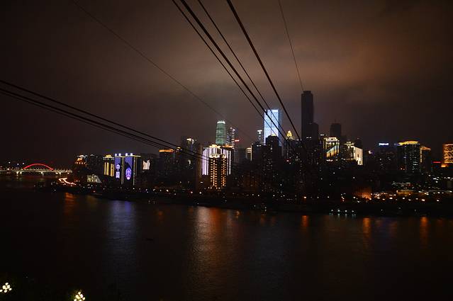 看完了朝天门我们转战下一个重庆特色——长江索道,电视上看到嘉陵江索道关闭的消息,不禁让人唏嘘,这可是重庆的标志,不过还好保留了长江索道。从朝天门前往长江索道站同样遇到了尴尬,朝天门长江沿岸比较僻静,尤其在晚上,有很多物流公司的库房在这里,路旁停着很多卡车,基本进不到出租车,打车软件等了半天都没人抢单,无奈还要靠11路步行前往,走到东水门大桥下面才发现,索道站在上面,还要走很多的台阶才能爬上去,当时腿都软了,又试了试打车软件,万幸终于有师傅来了,上车问师傅索道几点关,师傅说可能已经关了,心又凉了半截,不管怎么说还是到了看看吧,不得不说山城的地形太崎岖了,兜了好几圈才到了索道站,还好索道要到晚上10点才停,单程10块,往返20,当时也没多想就买了往返,然后就后悔了,问了也不能退,强烈建议大家买单程,到对岸转完了打车回来也差不多是10块,还能去别的地方不用回到索道站。长江索道有两个轿厢,同时运行,一去一回,上完就走,班次还是挺快的,上面可以俯瞰长江两岸,效果很不错,适合晚上看夜景。