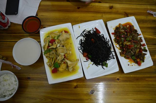 路上一般2小时停车休息一次,可以上上厕所伸伸腰,中午2点左右到了一个小饭馆吃饭,价格倒不算贵,一碗土豆红烧肉15元,8块钱一盘土豆丝,米饭2元一位管饱,足够两个人吃饱,味道也算不错。