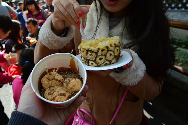 出了武侯祠,旁边就是锦里古街,里面也就是个仿古的商业街,有茶馆酒吧星巴克,纪念品和小吃,当时中午了,就随便吃了点小吃,后来听人家说本地人都不来这里,都去春熙路、文殊院那边的小吃街。