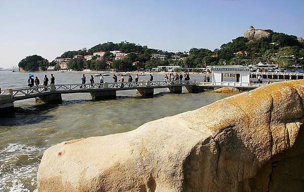 吃完后,我们打车去轮渡,买票做船去鼓浪屿,然后去菽庄花园逛了一圈,那里有个钢琴博物馆,带孩子们去看看,钢琴博物馆有两个展馆,而且里面有导游,但是导游有固定的介绍时间,要去欣赏的事先了解一下吧。我记性太差,忘了拍照了。菽庄花园不大,景色还不错,不过由于钢琴博物馆里只能看,不能摸,又没有导游介绍,所以孩子们兴趣不高,上蹿下跳中我们向龙头路进发了。鼓浪屿的龙头路有好几条,不过那个区域中有各种各样装饰的小店,吸引孩子们的是这个商区有很多的特色店都有自己的特色图章,还有卖敲章的各种小本子,这下孩子们来劲了,逛街不是为了看特色店,而且看自己敲了多少个章。我们喝了张三疯的那个特色奶茶味道不错,马拉桑的果汁,还行比上海的浓多了、吃了赵小姐的馅饼,酥酥软软的,是我喜欢的小吃,品尝了金包银,外面是用藕粉做的皮子不错,但是馅不好吃、还有点评上推荐的Babycat私家御饼屋,绿豆饼的外面比赵小姐的饼更软些,馅子都是差不多的。还有就是黄胜记的猪肉脯,黄胜记的店面实在太小,但是老板实在会吆喝,给出的试吃品都是大块的,所以好多人不是因为好吃而买,而是因为服务而买。个人觉得肉脯热的时候好吃,软软的,香香的,但是买回家硬硬的就差多了,不过可以微波炉转一下。朋友推荐猪肉柳和肉松。就这样喝喝吃吃,一会儿就到晚上了。晚上在问了几家龙头路上的海鲜店后,随便点了一些吃,这里的海鲜不够好,价格也比较贵,但是人是铁饭是钢,正餐还是要吃点的。