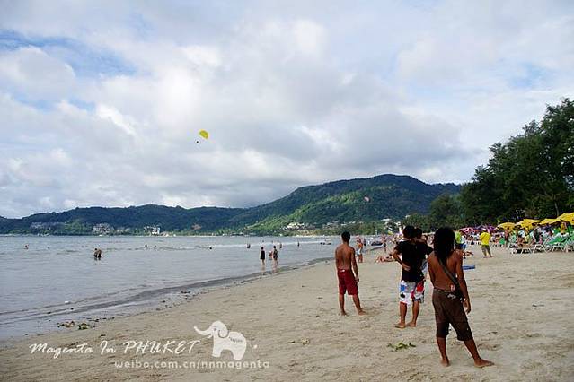 看看,这就是芭东的海滩。人多,海水也不美!开始在路上我还有些后悔没有带着泳衣过来,万一看到海不能下午游泳。但是来到芭东海滩一看,一点游泳的欲望都没有了。随便在沙滩上走走,就会围过来几个人呢问你是否要玩降落伞。我这人比较反感别人的推销,所以赶紧就跳开了。