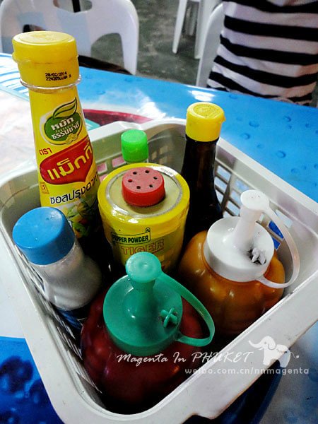 普吉的餐馆,不管大小,调味品都很充足,只不过我们基本上都不用,呵呵!我们这次点了椰奶鸡汤,炒粉丝,海鲜炒饭,还有空心菜。两杯芬达,花了390B。