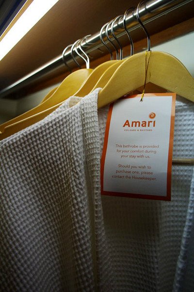 这家酒店提供的浴袍不错,但是我们俩人都各自带了睡衣,所以浴袍根本没有上身。看到衣架上挂的牌子了吗?看来这浴袍还是很受大家欢迎的。