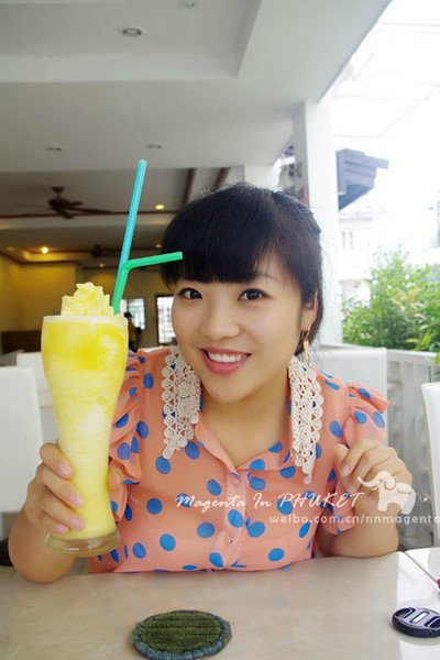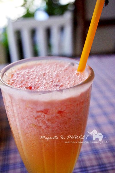 这里的菜单都是有图片的,看着点一般不会点到自己不想吃的东西。 又渴又饿,我和Anita都点了冰沙,我要了一个菠萝味的。结果一端上来我吓了一跳,好大的一杯,分量太足了吧!喝一口,菠萝味道很浓,好喝。后来我又试了试Anita的芒果冰沙,没想都比我的还要好喝,这件事情促使我以后和冰沙就点芒果的。这杯冰沙70B。