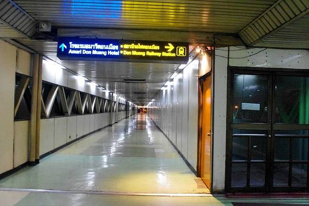 这就是机场二楼的长廊,有很明显的指引标识,左边蓝色显示直走到达酒店,右边黄色是通往火车站。这次来曼谷没有尝试火车,有点遗憾。