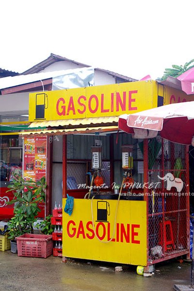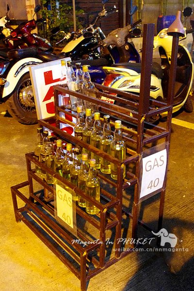 这就是街边的加油站!在普吉,摩托车是很基本的交通工具,不光当地人,就是在这里度假的老外,也会租上一个代步。我们在普吉的最后一天也租了一个,这个后面会详说。