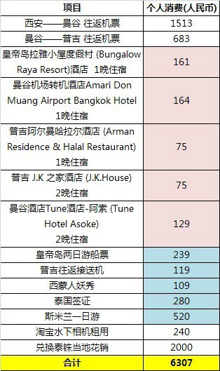下面是这次出行全部的花费。由于我们闺蜜行全程AA,这个费用是个人费用,就是我一个人花的钱。比如酒店的房费是150元/天,落在个人头上就是75元/天。去之前我在家里定好了所有能预定的事宜。去的时候兑换了2000人民币的泰铢,也就是9500泰铢左右,汇率4.76。在泰国当地再也没有取过钱,之前兑换的泰铢最后没有花完,还带回来了几百泰铢,给大家一个参考。