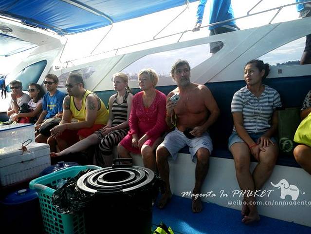 斯米兰岛的队伍里中国人比较少,澳大利亚和俄罗斯人挺多的,还有泰国的游客。看到照片中那个穿横条纹长裙的金发MM了吗?他是一个孕妇,而且肚子已经不小了,我估摸着得有5个月以上了。看到他在这样颠簸的船上,我都有些害怕,更别提后面和我们一起浮潜了。不过导游和船员们对他照顾有加,给他很多救生衣当坐垫,还一直看护着,怕他不舒服。