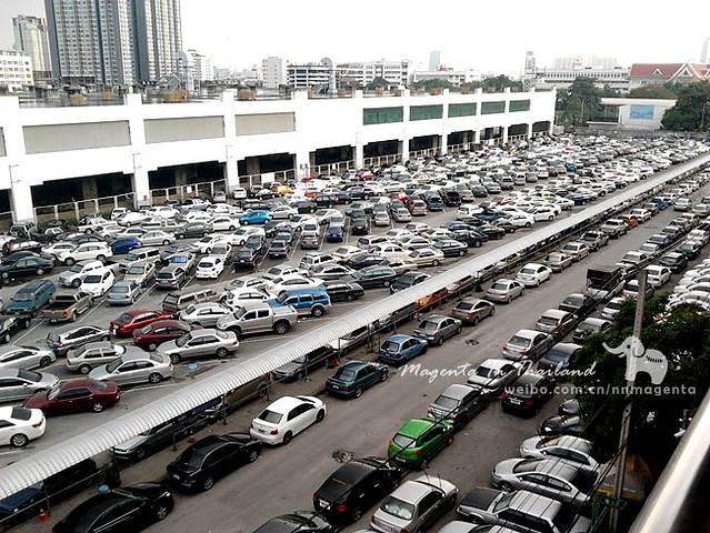从BTS俯瞰曼谷的一个停车场,好多车,但是井井有序。