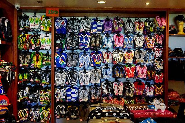 走着走着,我们看到购物店了,就进去逛逛。这一墙的拖鞋真抢眼,我忍不住给自己买了一双,哈哈!
