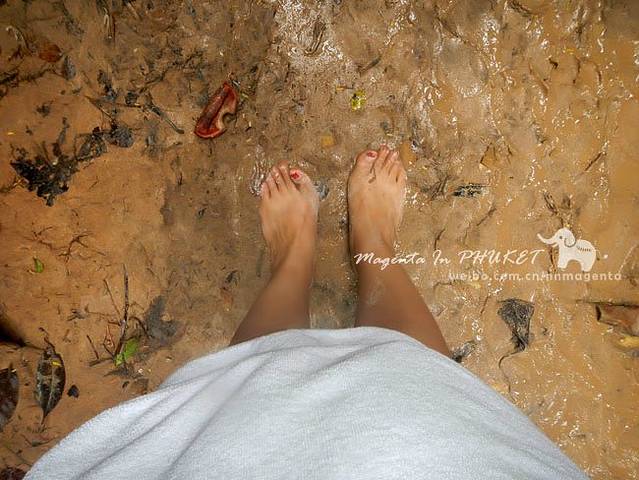 由于在码头的时候,导游就让我们脱掉鞋,全部光脚上船。所以到达岛上后我们也是赤脚的。为了看一片海滩,我们需要穿过整个岛(我不记得是几号岛了)。路非常难受,有扎脚的石子,和湿滑的稀泥。让我一路上不停喊疼!