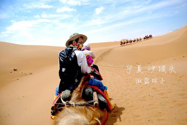 好吧,跟着驼队挺进大漠吧!一队骆驼有六只,第一只头驼是由驼队的人骑坐的,后面就是五人一组来分队了。米爸和小米坐在了第二匹,我在第三匹,于是对着他们的背影拍拍拍。好不容易二人回身给我打个招呼,那包得严严实实的小米,基本都快看不见了。米妈温馨提示:骑骆驼时一定注意保证头上帽子的稳定性,一旦随着前进的节奏,一阵风来把帽子给吹走了,是不会有人停下来给你捡帽子的。那时丢了就是丢了。所以要提前做好防范措施。此时如果你也用了脖套,就可以把脖套拉一半到头上,盖住帽子,这样就不怕风吹了。