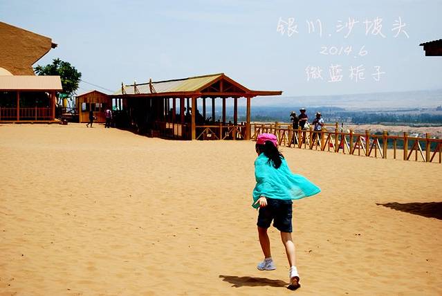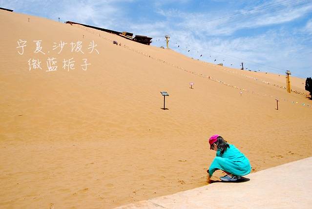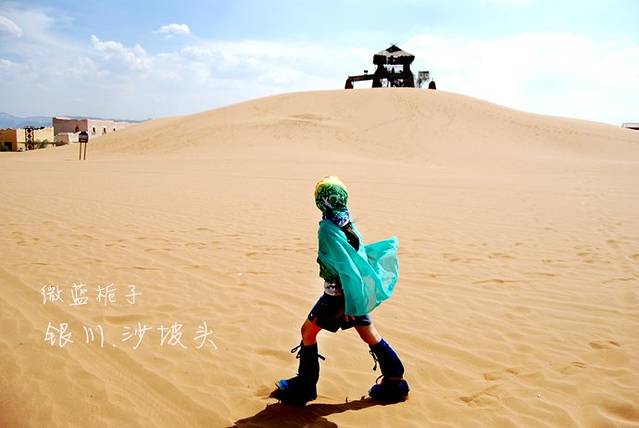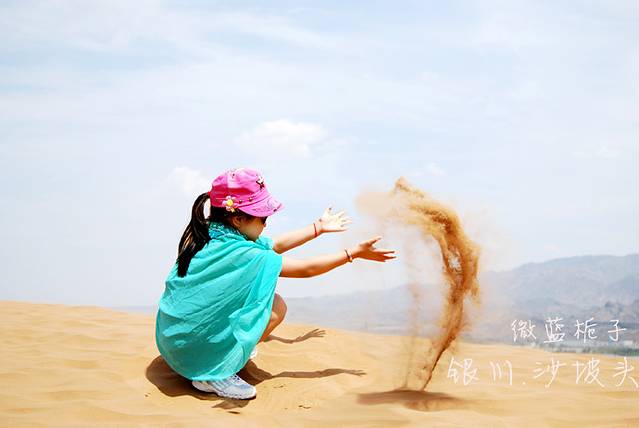 不管是去海边,还是在沙漠,防晒都是第一要务。玩得高兴的同时也要注意皮肤不能晒黑喽。沙漠防晒四宝:帽子、墨镜、防晒霜、防晒衣。给小米带了防晒衣,没想到人家不愿意穿,口口声声说不怕晒,最后在包里搜出来一条绿色的大纱巾。不知道为什么,出游前我抓了这条纱巾放在随身背的包里,却没想到在宁夏的这几天里,这条纱巾派上了大用场。第一大用场,就是在这沙坡头上,给小米当了披肩。既有了防晒的效果,也让她觉得自己像个公主一样披了个披风,于是我们俩皆大欢喜,都很高兴地接受了这一方案。