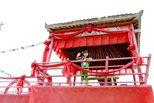 说实话,在逛完老银川一条街及偌大的明城后,再逛清城时,我们已经有些视觉疲劳了。此时传来了敲锣打鼓的奏乐声,远远望去,原来是导游曾经介绍说的绣楼招亲,有一个小姐有事没事就在楼上抛绣球。这回让我们遇上了。一个游客被小姐抛中了绣球,于是当场披上新郎服饰拜堂成亲。必须一提的是,座上的高堂,是一对带着孩子的夫妇,本是走累了坐那儿休息一下,结果莫名其妙就成了“高堂”。最后还有送入洞房,我和小米自然是凑热闹地也跟进去观看了。不过洞房一出,只停留在了用秤杆挑盖头这一幕,而且盖头还不让掀起。小姐且休息休息,过一会儿还要继续出去抛绣球呢!