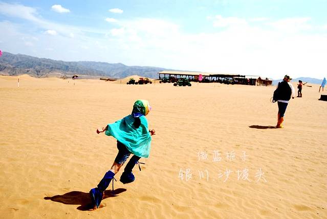 之前铺叙那么多,就是想说,这一次去沙坡头,我们很不幸是组团去的。旅游时我一向不喜欢跟团,因为行程无法自主决定。虽然基本上沙坡头好玩的我们也都领略了一番,但真真是不过瘾啊!如果是自由行,我会选择在沙坡头的沙漠酒店住上一晚,在这美丽的大漠之中至少玩两天,哪怕不玩那些游玩项目,就只是在沙漠上打个滚,再抓把沙握在手心,看沙子从手指的缝隙中细细地落下,也比来回匆匆地赶来得尽兴。尤其,对于孩子来说,一小堆沙子都能打发他们玩上半天了,更何况是如此浩瀚的沙漠。好在旅游多年,在心态上调整还是很快的,这一次旅游的意义就在于一家三口能一起出游,那么其他的,就都不用计较太多了。