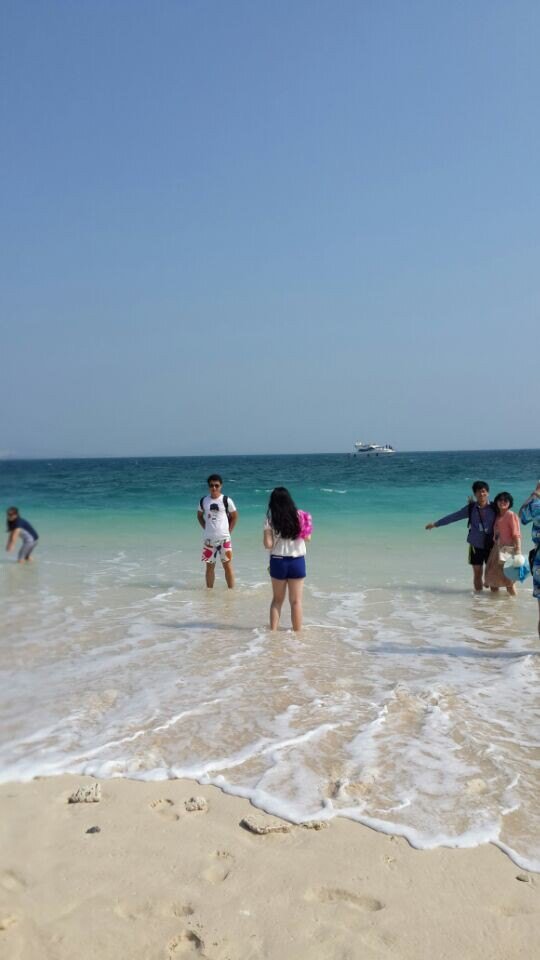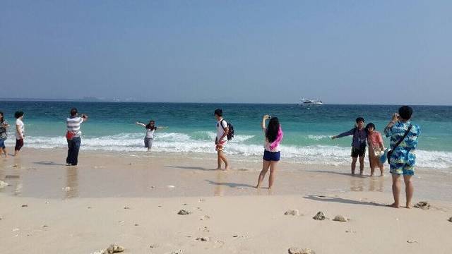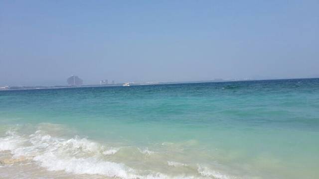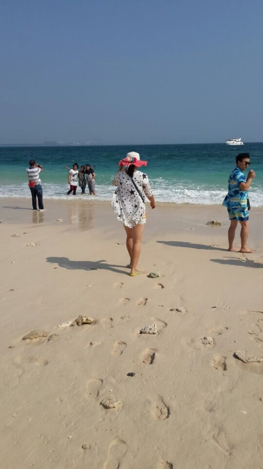 休整了一天后,继续出游,海南水质哪里最好,当然是蜈支洲岛喽,所以,赶紧的吧,由于去的时候还是国庆,价格比之前上涨了,在比较了淘宝和当地旅行社之后,觉得淘宝上价格比较有优势,评价也还不错,所以就在淘宝上订的。服务和旅行社是一样的。蜈支洲岛上的东西那是相当的贵啊。简单冲澡和储物柜一个人50 啊。吃饭更是不用说了,幸好自带粮食。那么好的水质不潜水简直是浪费,但是价格也是相当的高啊,潜水都在300大洋之上啊,还且只有短短的十分钟啊。旅行社有个套餐是300的套票,包括船票和远洋深浅还有自助海鲜餐,还有摩托艇之类的,乍一听很合适啊,亲,忽略了一个重要的地方,那就是此套票不上岛!!!不上岛的意思是你一直在船上度过4-5个小时。不会让你接触蜈支洲岛洁白的沙滩和湛蓝的海水。算了,反正对潜水不是很感兴趣的,看看别人的图片和海底世界就好了撒。其实还是一个字啊,穷啊么呵呵。蜈支洲岛上确实美啊,不过听导游说这是个私人岛屿,3分之二的地方都被私人承包了,不让游客参观的,若想蜻蜓点水般参观下的话,是需要做游览车的,有两个价位80和120。80元的是30分钟,中间不停,120元的是停靠三站,可以下来拍照。在经过深思熟虑后,决定不做。两个人悠闲的漫步在沙滩上,看看别人拍照,看看清的透明的海水,也是一种享受啊。哦了,就这么愉快的决定了。蜈支洲岛上到处都可以看到被海水冲上来的珊瑚,和各式各样的贝壳。幸好背了背包,让我们做个捡贝壳的小伙伴吧。到蜈支洲岛上的全是拍照的。难怪,这么美的景色,不留在相片中都可惜了呢!