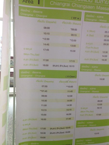 清迈到清莱往返的时刻表,有3种价格,一种是VIP 288猪,好像区别就是20座的大巴,一种普通的185猪是40座的,车内有WC,最便宜的是150的车内没有WC,我们买的185的,当时就把清莱回清迈的返程票也买了。乘坐感觉和国内的大巴差不多,但是人家要发矿泉水和饼干。