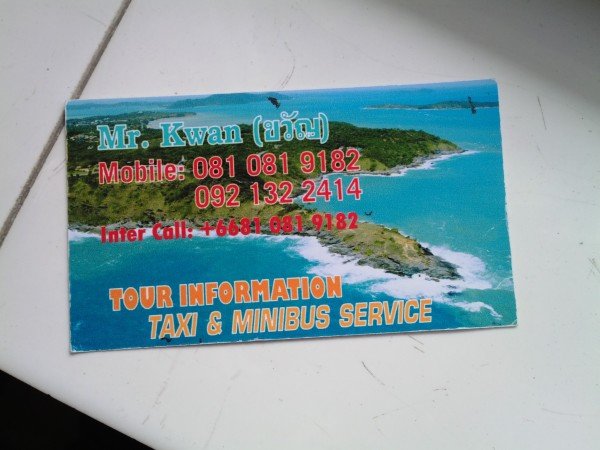 一心想踢沙滩足球的我们,打算找个TAXI去卡塔海滩,就在江西冷那条主干道随便找了个停在路边的出租问价,司机是个当地的小伙子,这哥子真的太扯了哈,我们问他好多钱去卡塔,他说400猪,我们还价300,一番口舌之后,他降到了350,我们还是坚持300,他突然说你们等着,我们以为他要去爪子勒,结果他去车上拿了个硬币下来,指到硬币说“这面350,那面300,你们自己丢”,哈哈,我们不争气的丢到了350那面,太喜剧了哈,那就350嘛,走起。后来我们才发现他收费确实公道哈,我们回来都是400猪,所以最后一天去卡图蹦极都是在酒店给他打了个电话,他就来接我们了,包接送才300猪,我们问其他人都是600哈。下面贴张他的名片和酷照,你们到了芭东想去什么景点之类的,可以电话他来酒店接你们,方便,而且收费合理!