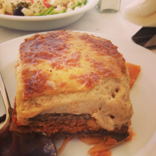 在希腊吃了两次的mousaka,它是由一层cheese,一层茄子,一层肉馅和一层土豆放在一起烤制而成的,味道不错