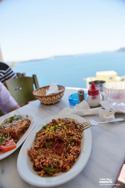 这天中饭在名为lotaz的店解决,在看日落方向的小路上,有海景阳台,oia的左右两边的美景尽收眼底,点的是calamari鱿鱼饭,鱿鱼比较好吃,米饭不是我们的菜~口味偏重,一句话,还是不太能接受希腊当地菜拉