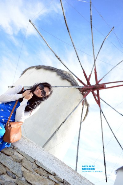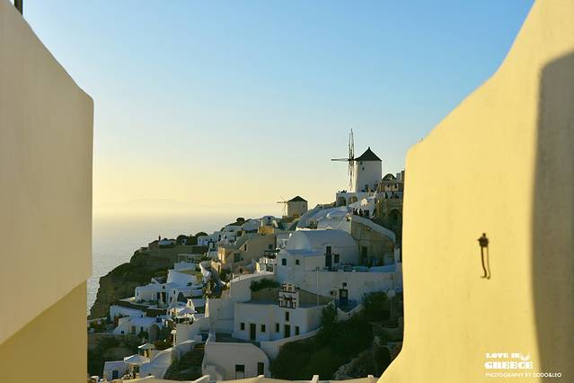 我们穿过米岛镇迷宫般的小路,来到海边的餐厅,远处就是那几个明信片上常出现的风车啦~