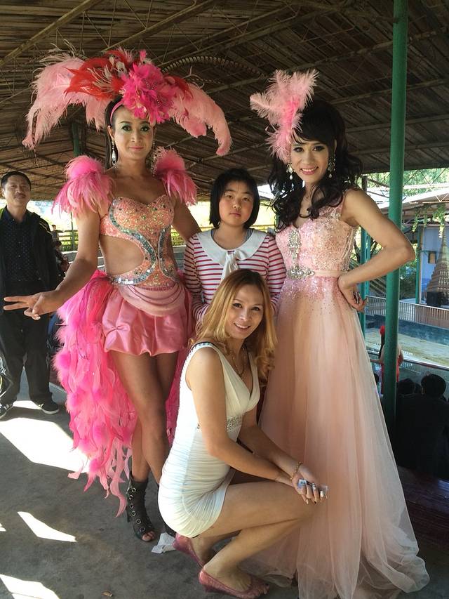 好了,说一下人妖馆吧,和鳄鱼是一个,因为一直对泰国充满幻想,想着在祖国就能完全心愿了,结果去了之后完全失望。进园之后不大点个院儿,像进了农家院一样,再往里走有个表演台,先有个鳄鱼表演,还可以。跟人妖照相也被坑了!说是一张20,结果临要照时另两个人妖也跑过来,一起照了,结果要了每人20,这一张花了60元。人妖表演一点没意思,跟闹着玩似的。