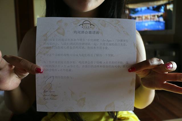 前台服务人员给我们这一批登岛的游客介绍AYADA的概况和上岛须知,大堂坐的都是中国人,经理旁边还站了一位中文服务人员,讲完以后大家都不约而同地鼓掌了,有一种听领导致辞的感觉o(╯□╰)o
