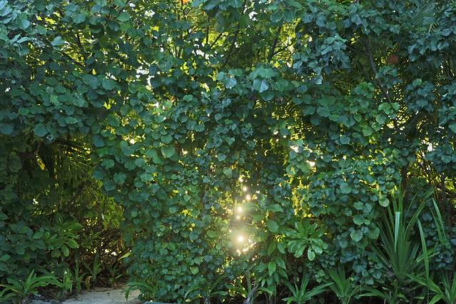 昨晚睡前突发奇想,如果不关窗帘睡觉,明早会不会被晨曦叫醒。结果我错了,叫醒我的依然是那只海鸟,可是当我睁开眼睛时,透过玻璃窗看到晨曦穿过院子里的树叶,悉悉索索地照到了地上,整个人都不好了,踹了老公两脚便穿着睡衣跑到了沙滩上。