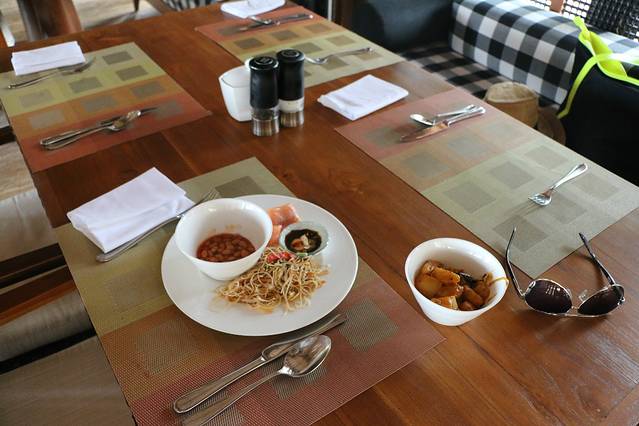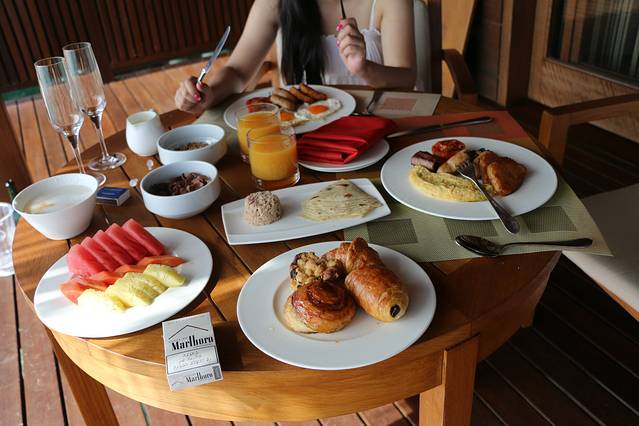 拍完照回屋子吃蜜月早餐。东西不好吃,可是此情此景,让人幸福指数很高。