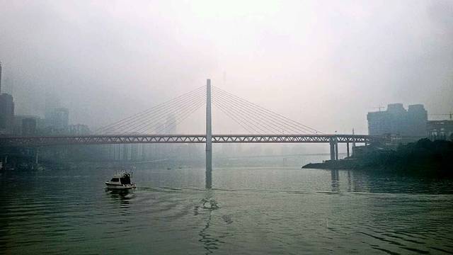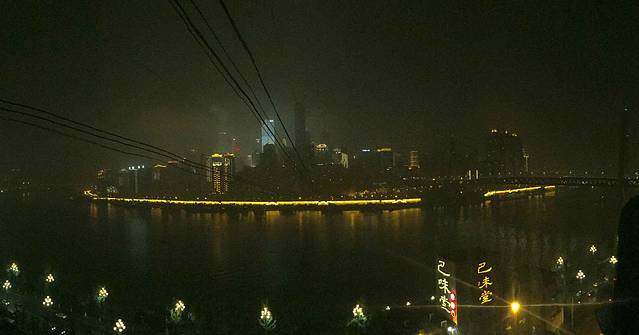 说朝天门有重庆最大的一口鸳鸯锅,一般是长江略浑浊为辣汤,一半是嘉陵江清澈为白汤,两江交汇泾渭分明,可以那天下着雨,雾很大几乎没有看到这样的景色
