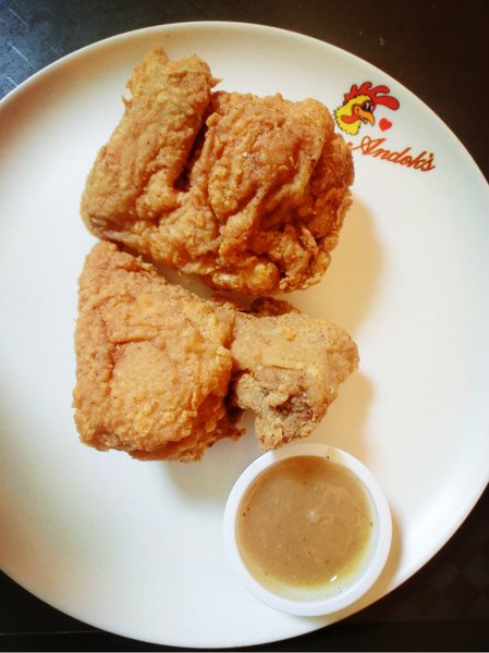 这里的鸡肉很嫩,炸鸡的蘸酱是土豆泥,味道不错