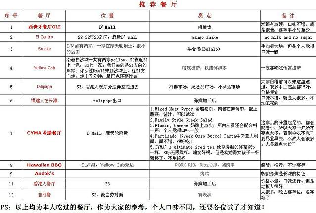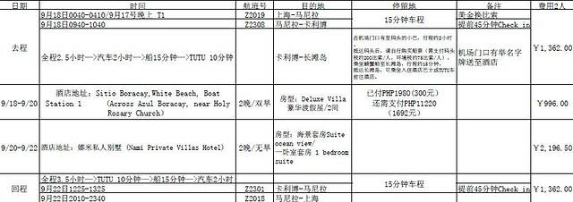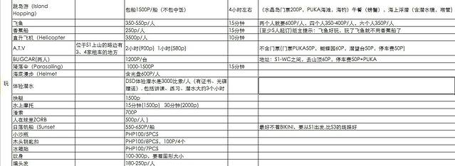 以下3个表格都是淘宝定的长滩岛娜米酒店客服小禹倾情奉献的