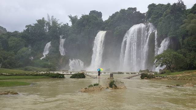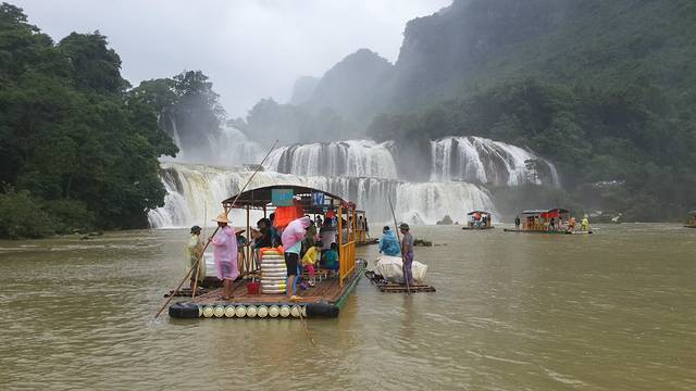 下到瀑布边上,瀑布声震耳欲聋,有船可以到河中游玩,30元/人,给送到河中瀑布下方过一趟,也会经过对岸越南那里,但是不可以上岸,有许多小贩兜售他们的特产。