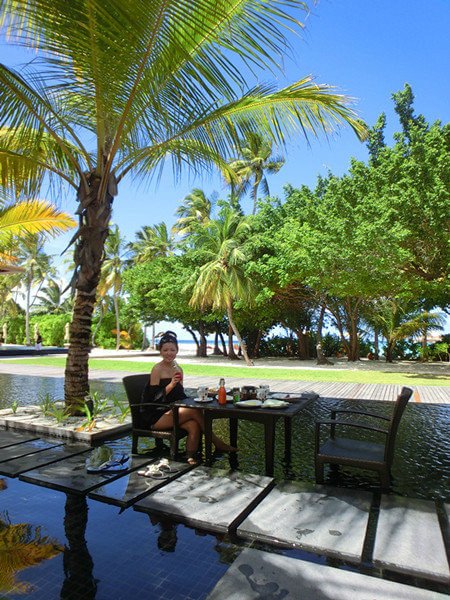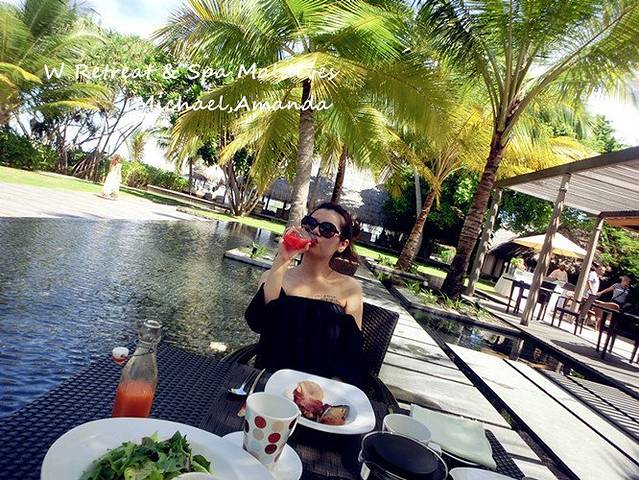 早餐我们选在了在室外~!都来了这里了没有再怕晒的!水上餐厅哦~脚是泡在水里的