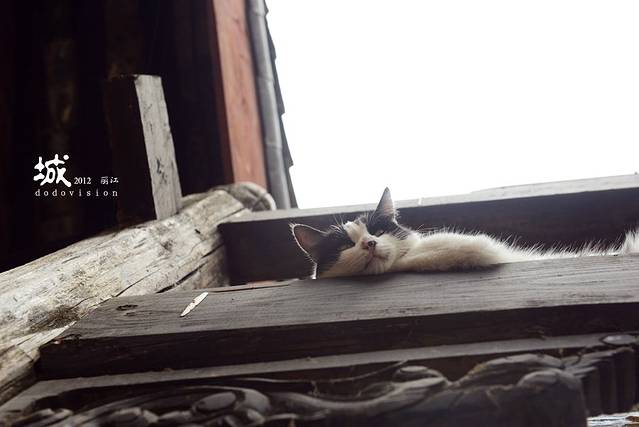 一家客栈进门口房梁上的悠闲猫咪一只,一直以这个pose发呆中