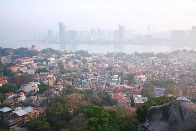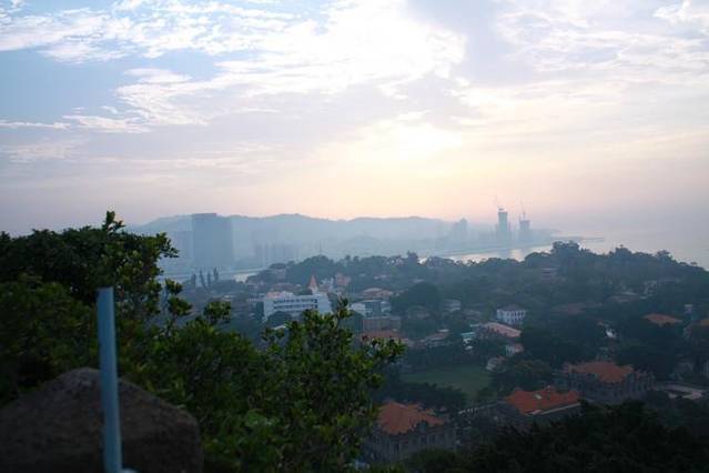 日光岩本身就是一块巨大的岩石,不超过50米,沿着岩石上凿的石阶走就可以了。因为起个大早,所以人不是很多,好像也就七八分钟就到岩顶了吧,岩顶上的空气很好,阳光的温柔度恰到好处,可以俯瞰整个鼓浪屿、遥望厦门,景色优美。