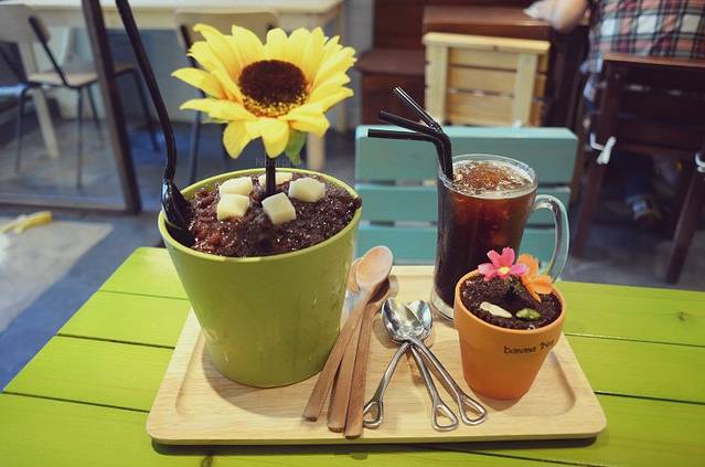 应某人的强烈要求把她屁掉了咳咳。真的好看到流泪啊!!我们点了雪花花盆刨冰,美式咖啡,花盆蛋糕(蓝莓味)~~