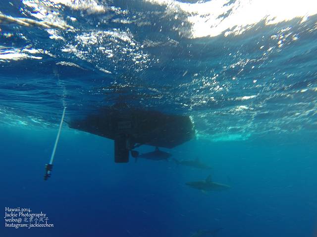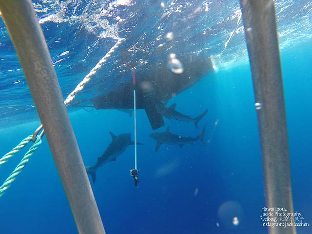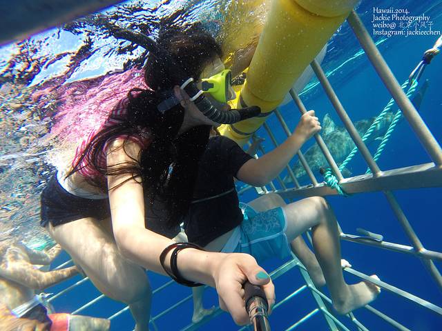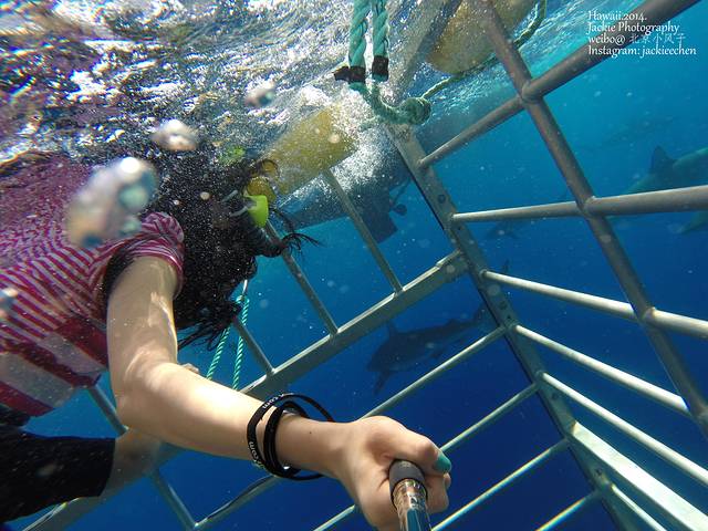 大概7个人一个笼子,20分钟一次。每船10多人的样子具体不记得了。当时是$98和鲨鱼游泳。他们有去honolulu接送的服务~50美金。我觉得不值,就和同学一起,顺道玩玩北岸风光。$75录像。我和同学平分买的录像~