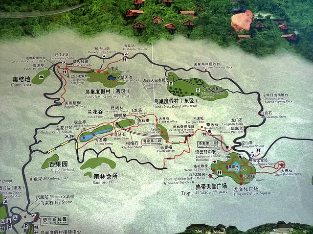 到了天堂森林公园,这是入口的地图,我们搬着行李来的,门口可以寄存行李,这个地方有导游,开始会微微介绍一下,之后就骗你说没有导游会走丢,之类的,其实里面标志很明显,不会走丢。