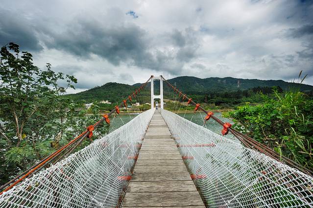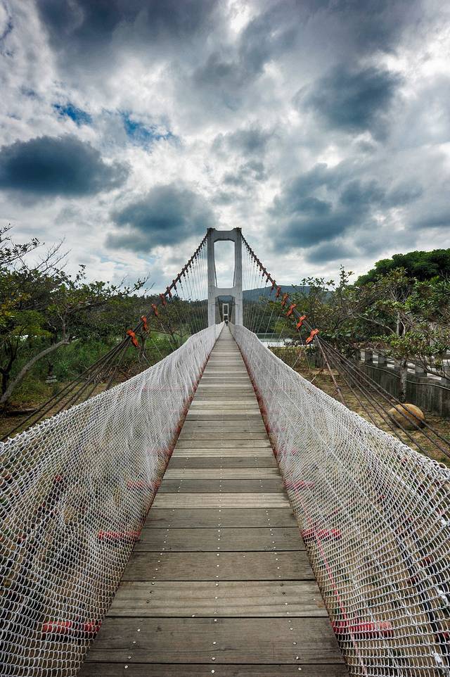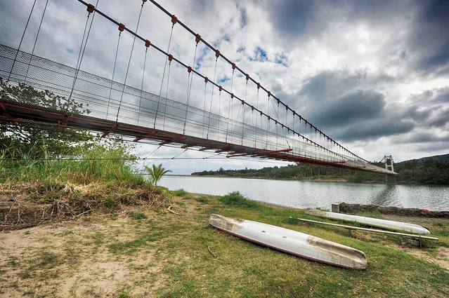 沿着海滨公路一路北行,到达满州乡港口村就能看到港口吊桥,这是一座斜拉桥,周围是一派台湾乡村的田园风光,河边还摆放着独木舟。
